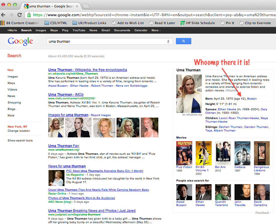 This one completely creeped up on me when Google introduced it a few months ago. I was watching an episode of Glee guest starring Uma Thurman when someone made a reference to her character being in her early 30s. “Well that can’t be right” I thought, “Uma Thurman must be older than that. Gee, I wonder how old she is?”. Being a modern woman in the year 2012, I always have a computer on my lap while I watch TV. So, I fired up a new tab and put “Uma Thurman” into my Chrome address bar. The page loaded and there it was: “Born in 1970 (age 42)”. I closed the tab and went on my merry way.
